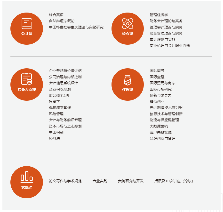 立足華南經濟沃土,集成我校“985”品牌工科優勢,依托我院管理學科的綜合實力,致力于培養會計財務專業基礎扎實,能有效借助會計學、管理學和經濟學工具解決會計與財務相關領域的實踐問題,具備綜合決策能力、創新精神、國際視野以及粵港澳協同思維的復合型、應用型和戰略型高端財會專門人才。